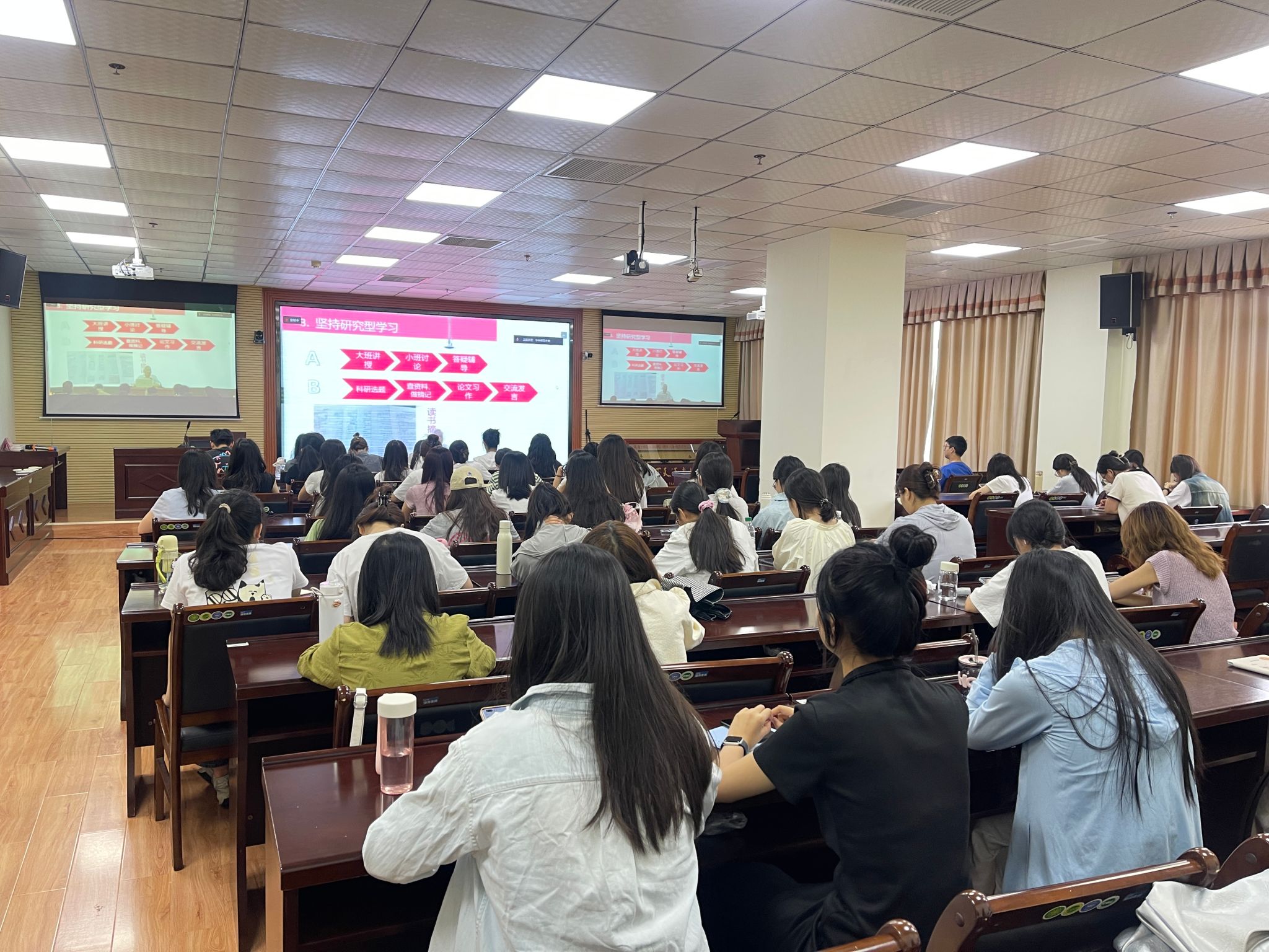 在“专业第一课”阶段,思想政治教育专业创始人之一张耀灿教授以《做有理想有本领有担当的好青年——我在大学是怎样学习》为题,深情回顾并分享了个人在大学阶段的求学经历与心路历程,激励青年学子以热爱为引擎,深耕马克思主义理论,为人生奠定坚实的思想基础,勇担时代赋予的使命。国家“万人计划”教学名师王忠文教授以《思政课知行统一的思考与探索》为题,通过生动的教学案例,深刻阐述了“知信行相统一”的教学理念,为思政课堂的创新与实践提供了宝贵的思路与方向,进一步坚定了学子们的教育信仰与职业追求。国务院学位委员会学科评议组成员、国家“万人计划”教学名师万美容教授则从历史维度出发,系统梳理了思想政治教育学科四十年的辉煌历程,强调了其时代价值与现实意义,极大地增强了学子们对专业的认同感与自豪感。