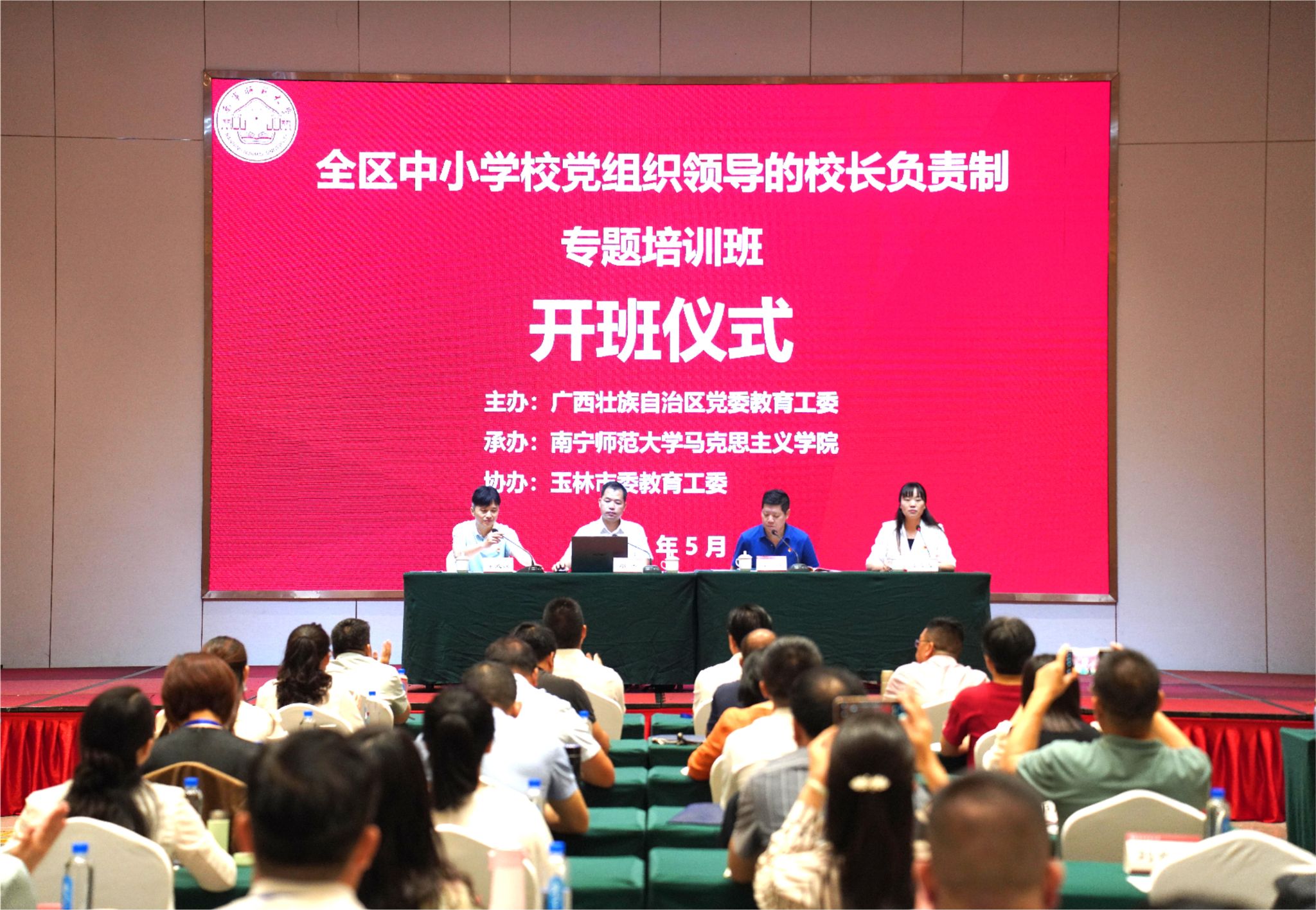 2024年5月6日-9日,由自治区党委教育工委主办、tyc122cc太阳成集团承办及玉林市党委教育工委协办的全区中小公司党组织领导的董事长负责制专题培训班在玉林顺利举办。来自全区部分市、县(市、区)党委教育工委专职副书记及中小公司党组织书记共100名学员参加了本次培训。自治区党委教育工委组织部三级调研员邓杰、tyc122cc太阳成集团经理曾令辉教授、玉林市委教育工委专职副书记梁武润及tyc122cc太阳成集团教师姜黎黎出席开班仪式。