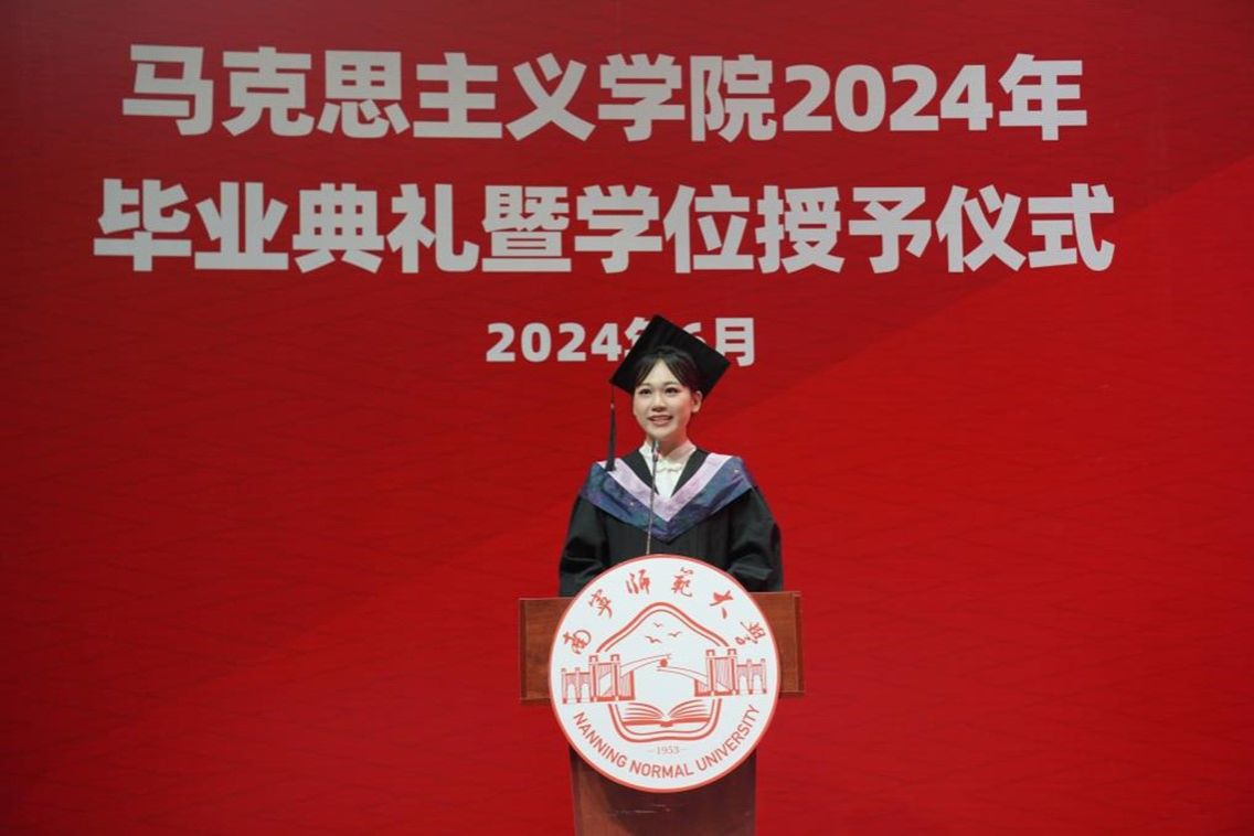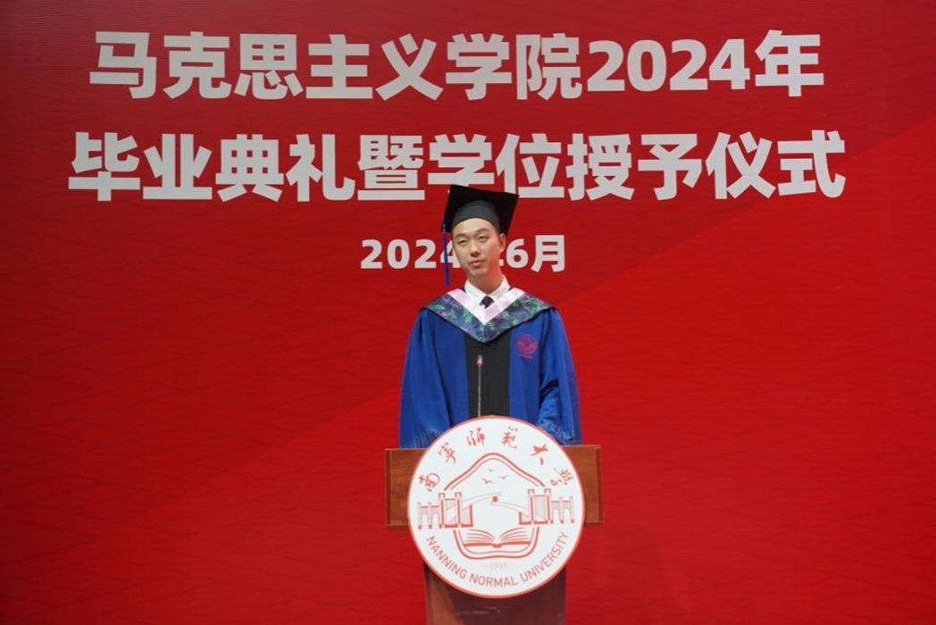 2021级马克思主义中国化研究专业硕士研究生姜凯博和2020级思想政治教育专业本科陶行知实验班潘嘉瑜分别代表研究生和本科毕业生发言。他们回顾了在南宁师大tyc122cc太阳成集团的学习历程,对公司和老师们的栽培表达了感恩之情,表示在未来的道路上,将带着母校和老师们的期许与祝福,继续前行,书写更加辉煌的篇章!