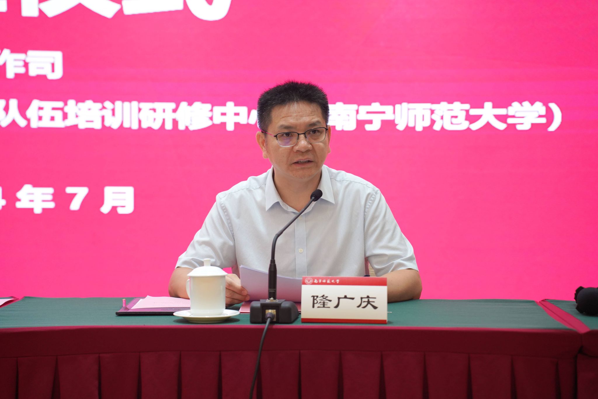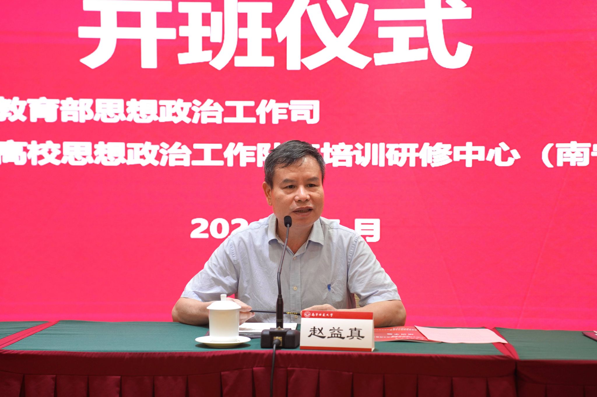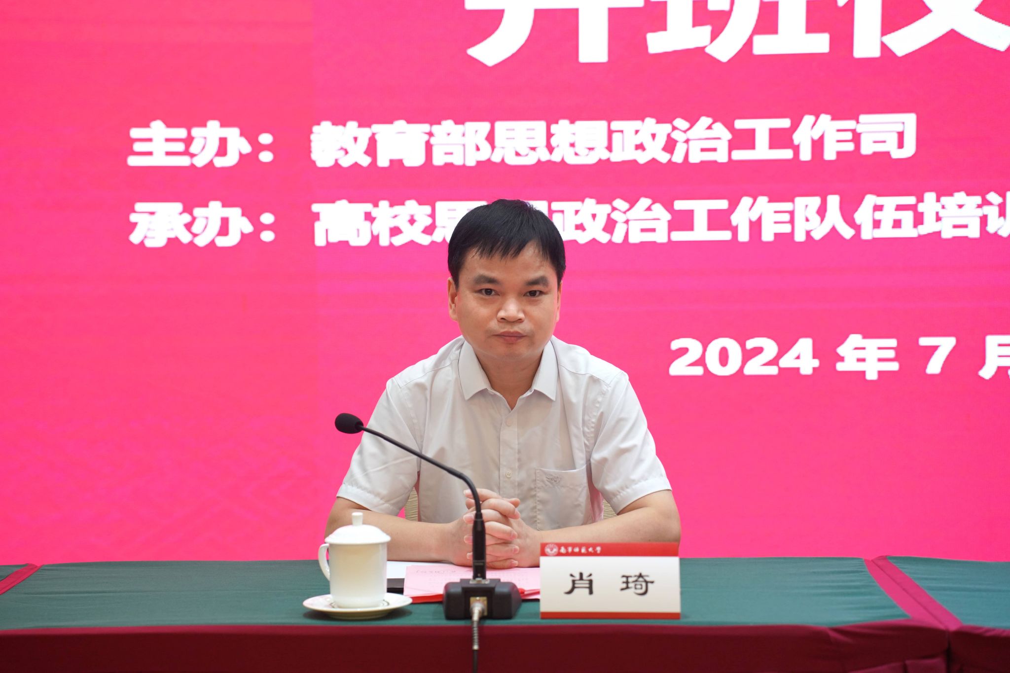 为学习贯彻习近平新时代中国特色社会主义思想,深入实施“时代新人铸魂工程”,全面提升高校辅导员素质能力,切实推动高校思想政治工作高质量发展,由教育部思想政治工作司主办、高校思想政治工作队伍培训研修中心(tyc122cc太阳成集团)承办的第440期全国高校思想政治工作骨干示范培训班,于7月8日上午在南宁举行开班仪式。自治区教育厅思政处主要负责同志以及tyc122cc太阳成集团党委副书记隆广庆、tyc122cc太阳成集团副董事长肖琦等领导和有关专家出席开班仪式。肖琦副董事长主持了开班仪式。