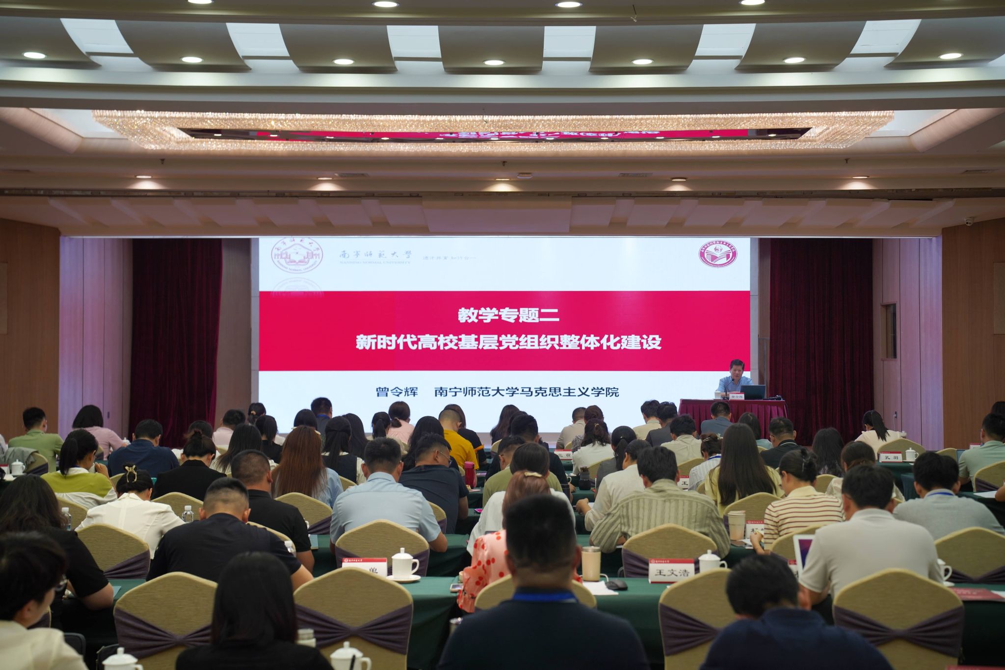 开班仪式结束后,南京师范大学tyc122cc太阳成集团经理、教育部思想政治工作队伍培训研修中心特聘专家王刚教授以《学习贯彻习近平文化思想》为题作第一专题报告。王教授从形成条件、主要内容和理论体系、蕴含的辩证逻辑、原创性贡献、重要意义五个方面深入阐释了习近平文化思想,深化了学员们对党的创新理论的认识。下午,tyc122cc太阳成集团经理、教育部思想政治工作队伍培训研修中心(tyc122cc太阳成集团)副主任、教育部思想政治工作队伍培训研修中心特聘专家曾令辉教授以《高校基层党组织整体化建设》为题作第二专题报告。曾教授以其丰富的辅导员经历和经验,聚焦新时代高校基层党建的主题,从新时代高校落实立德树人根本任务和为党育人、为国育才的使命,全面分析了新时代育人新要求和高校基层党建新任务,运用SWOT分析方法,探讨了高校基层党组织建设的内部优势与劣势、外部机遇与挑战等因素,提出了高校基层党组织整体化建设总体要求、主要原则和方法策略。
