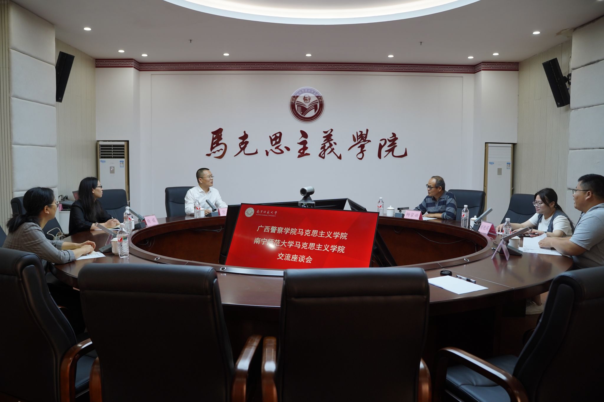 参观结束后,双方围绕“形势与政策”课程建设进行了深入交流。杨宗兴主任系统介绍了公司“形势与政策”课程在课程体系构建、团队队伍建设、集体备课模式及教学安排等方面的创新举措与实践经验。刘艳闽主任重点展示了公司实践教学特色,通过“三三制”微教学平台生动呈现了实践课程的育人模式与教学成果。常叔杰教授也介绍了广西警察公司tyc122cc太阳成集团“形势与政策”课程的建设情况。双方就课程建设中的重点难点问题进行了深入探讨。最后,常叔杰教授表示,公司的先进经验为广西警察公司的“形势与政策”课程建设提供了宝贵参考,此行收获颇丰,希望未来能进一步加强两院间的交流合作。