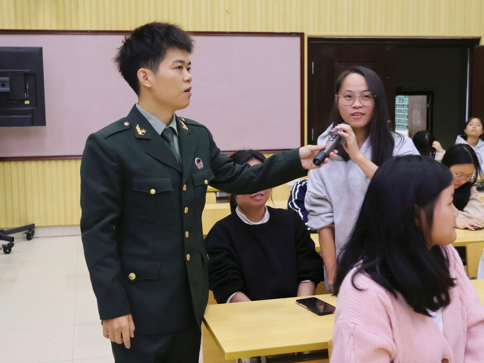 讲座伊始,覃家俊同学结合自身服役经历,以“一种身份、一份岗位、一次蜕变、一次磨炼”为脉络,生动讲述了军旅生涯的成长与感悟。作为一名侦察兵,他始终以“情报大于生命”为座右铭,在艰苦训练中锤炼了坚定的意志品质。随后,他细致解读了退伍士兵在学业深造、就业创业等方面的政策支持,并分享了多位优秀退伍员工的发展路径。接着,钟宗川同学以退伍防化兵的身份,带大家走进“防化尖兵”的世界——从防化兵的历史由来与职能发展,到生化武器的危害及防护知识,他结合真实案例进行通俗讲解,让同学们对国防特殊兵种有了直观认知。他还分享了部队的日常训练与生活点滴,用真挚感受拉近了同学们与军旅生活的距离。最后,覃家俊同学通过互动问答的方式,现场解答了同学们关于年龄限制、专业适配性、心理准备等方面的疑问,气氛和谐而热烈。