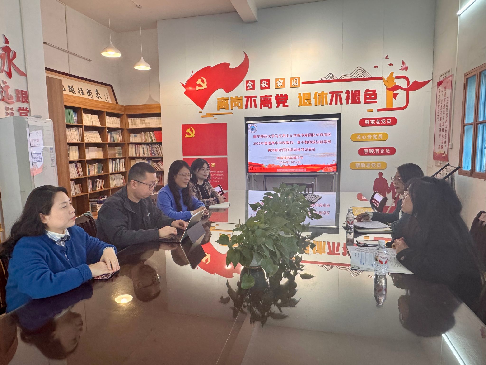 此次活动不仅对参加“2025年自治区普通高中新任教师胜任能力培训班”的边境公司思政课教师进行了返岗跟踪指导,还深入那坡县高级中学、靖西中学及龙州县高级中学的思政课课堂,通过听课、评课、磨课等形式,实地指导课堂教学。同时,教研室教师参与了防城港市防城中学的教育科学研究课题开题与中期汇报活动,并就课题研究方向与方法提供了专业建议。